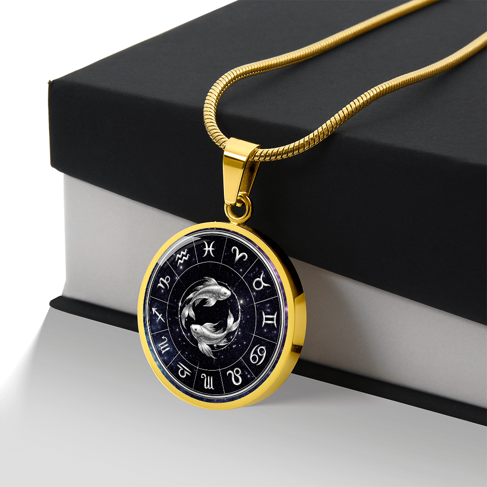 This necklace features a round, silver-tone pendant with a celestial zodiac design set against a deep night-sky background. The zodiac wheel surrounds two silver fish at the center, symbolizing Pisces through balance and flowing movement. Finished with warm metallic details and a timeless circular shape, this piece is designed for everyday wear and lasting meaning.